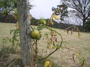 しばらく振りで行って見たら、赤く熟したものが1個、皮だけ落ちていました。(カラスが食べたのでしょうか…?)でも、このトマトは丈夫です、あの強風にもめげず、未だ10個の実をつけています。施肥もしていないのに、よほどこの芝生が合っているのでしょうネ! |