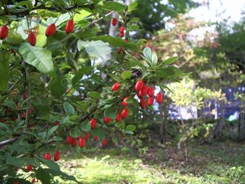 メ ギ(メギ科):目 木 葉や枝の煮出し汁を目薬としたことから名づけられました。樹皮は黄色の染料、茎は胃の薬になると云われています。茎は細いトゲだらけで鳥もとまれないので「コトリトマラズ」とも呼ばれています。 |