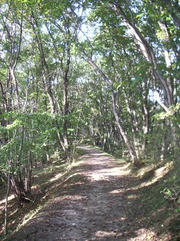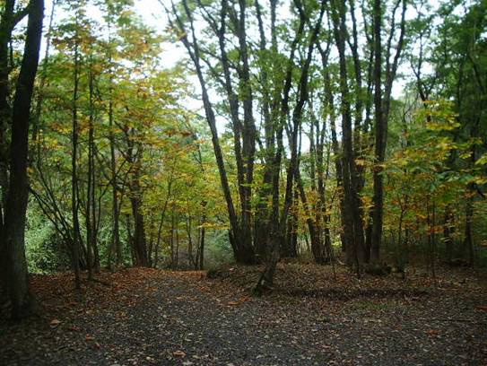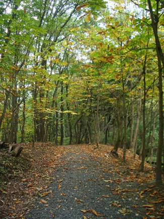 菅野沢溜池入口からアヤメ園を通って中央記念館 へ抜ける遊歩道です。今、カツラの葉っぱの絨毯 になって甘いにおいの遊歩道になっています。 |