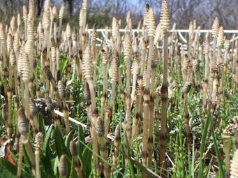 4月22日 ―ツクシー (トクサ科) スギナの胞子茎、スギナに付いて 出るので付子と云われています。 庭や畑では困ってしまう植物です。 |