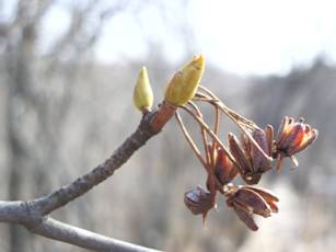 4月10日 −ドウダンツツジの新芽− (ツツジ科) 前年の実の殻を残しながら、新芽が膨らみ始めました。 |