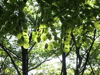![]() 5月21日 −カツラ−(カツラ科) 丸い葉っぱが特徴です。樹木自体が良い匂いがして、落葉後の枯葉まで甘い匂いをさせる不思議な樹木です。 |