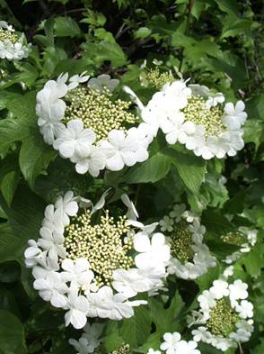 ![]() 5月27日 −カンボク−(スイカズラ科) 花序は中央に多数の小さな両性花それを巻くように大形の中性花(装飾花)をつけます。中性花の花冠は5枚径3cmくらいで目立ちます。果実は球形で赤く熟します。 |