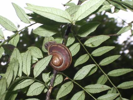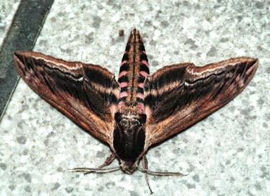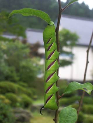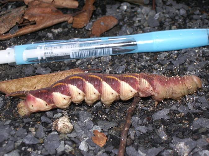 エビガラスズメ 胴体に紅色の縞を持っていて、口吻が長い。幼虫・成虫とも色彩の変化が著しい。幼虫はヒルガオ科の植物を食草としています。先日の側溝の清掃作業中、ケヤキの下を這っていました。遊歩道のコースなのでお客様に踏まれては・・・と思い、林の中へ誘導しました。 |