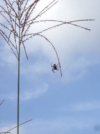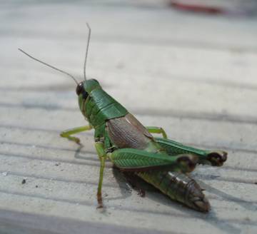 ― ミヤマフキバッタ ― 一見するとイナゴのようにも見えますが、別の種類です。よく見ると、ハネが小さくてウロコのような形をしています。図鑑によると、このバッタに近い種類には、フキバッタやアオフキバッタがいますが、やはりハネが小さかったり、無かったりします。山地の暗い林の下草や、低い木の葉の上に見られます。フキバッタの名前の由来は、フキの葉を良く食べるからといわれていますが、フキの葉に限らず、いろいろな植物の葉を食べます。 |