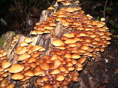 別名「キツネノチャブクロ」とも呼ばれ、梅雨期から秋にかけて、林内や庭先などの落葉や落枝に群生するキノコです。 あまり食べられそうには見えないのですが、図鑑によると、若いうち(きのこを2つに割ってみて内部が白い時)だけは食べられるとのこと。成熟して胞子が多くなったものは食べられません。成熟するとてっぺんに穴が開き、胞子が煙のように吹き出します(これがホコリタケの名前の由来)。胞子は吸い込まないように注意が必要です。写真のものは傘の直径が2〜3pぐらいで、割ってみたら黄色く、胞子が少しできかけていました。 |