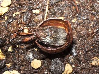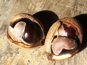 アスレチックコース、最後の沢道に大きなトチノキが有りますが、今、盛んに実を落としています。中には仲良く2個入って、栗の実みたいな物も見かけます。このままでは食べられませんがアク抜きしてから「トチ餅」等にして食べたことは有りませんか・・・?この木の花から採れたハチミツは高級品と云われています。 |