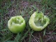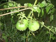 | 四季の森の「芝生のトマト」は心配していた通り、写真の様に未だ青いのに、突っつかれて3個の被害です。(現場を見ていないので断言はできませんが・・・カラスの仕業と思います)待ちきれなくって食べたけど美味しくないので途中で止めたのでしょうか・・・?残りは未だ3個有るのですが、赤くなるまで待てるのか、カラスの学習効果の試しどころです。 | ![]() |