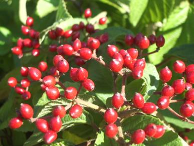 −ミヤマガマズミ− (スイカズラ科) ガマズミに似ていますが、葉に光沢が有り、全体に毛が少なく、葉の側脈の走り方が端正であるので区別ができます。 |